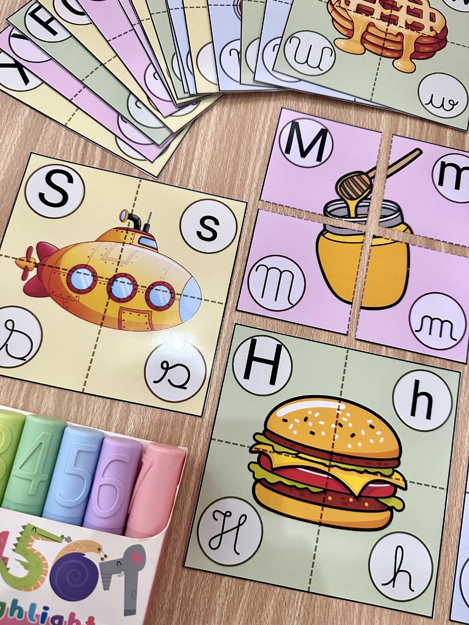 O arquivo Alfabeto nas 4 Formas traz um quebra-cabeça para cada letra do alfabeto, apresentando as quatro formas da letra para que a criança realize o pareamento corretamente. O material também acompanha uma caixinha para guardar as peças, tornando o uso mais prático e organizado.