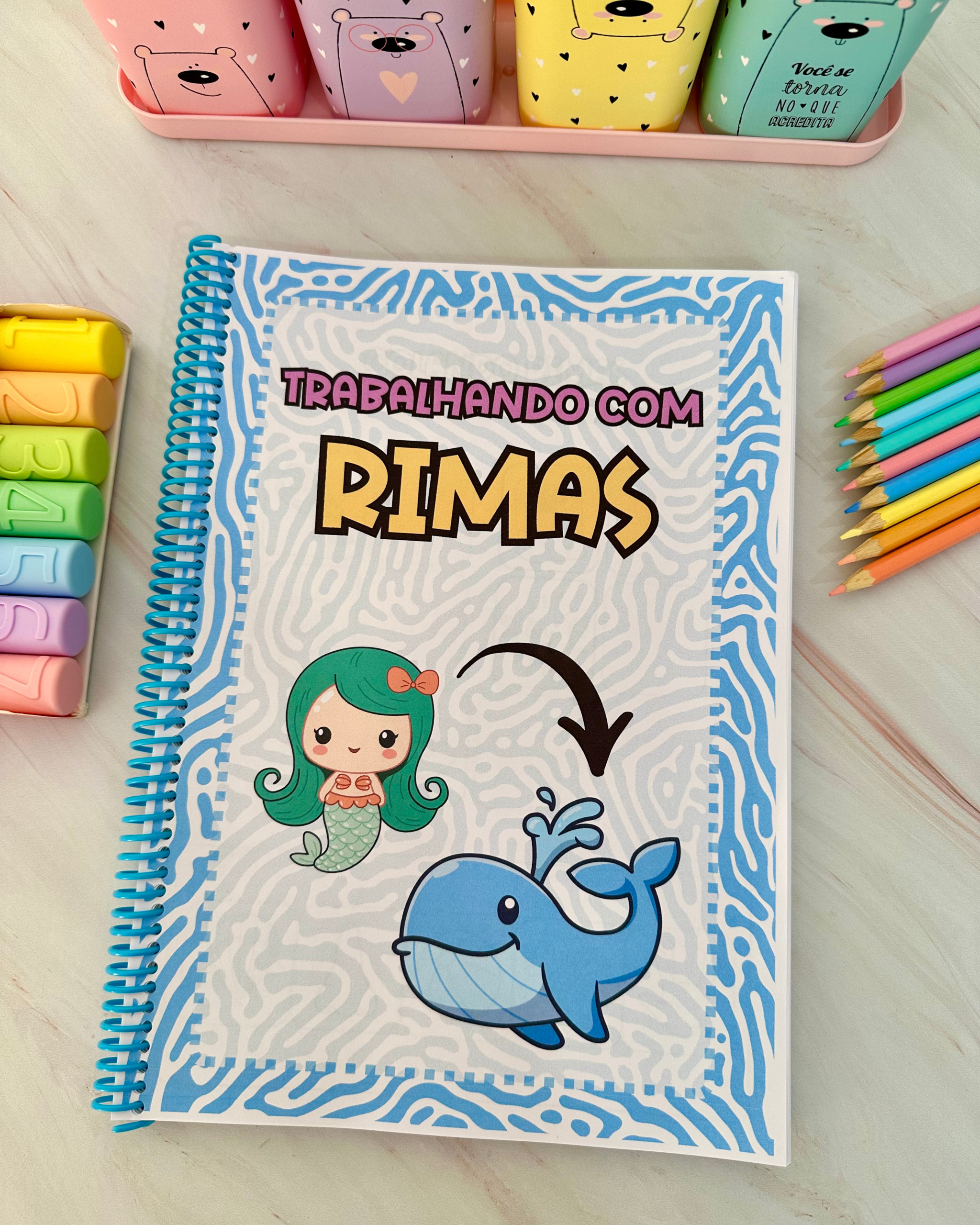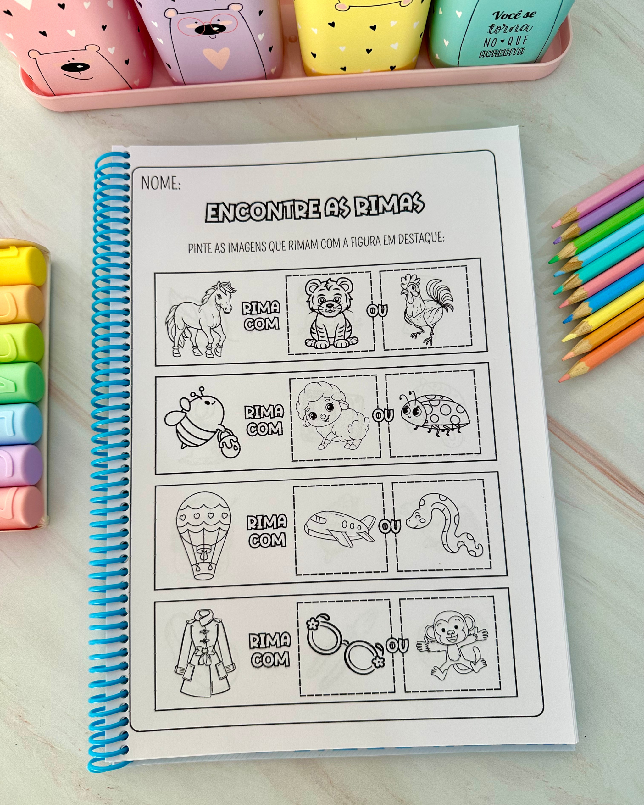 Apostila de atividades para trabalhar rimas com 85 páginas. As atividades são para colorir, e o