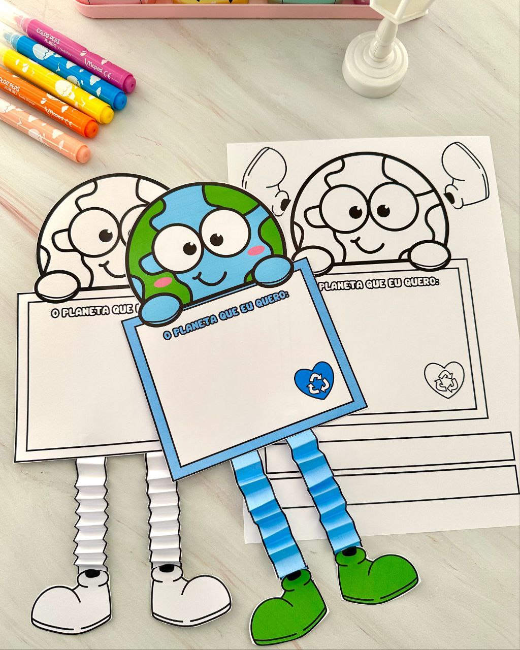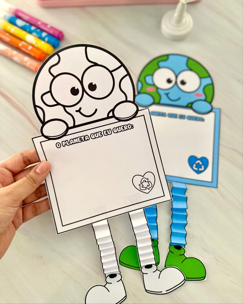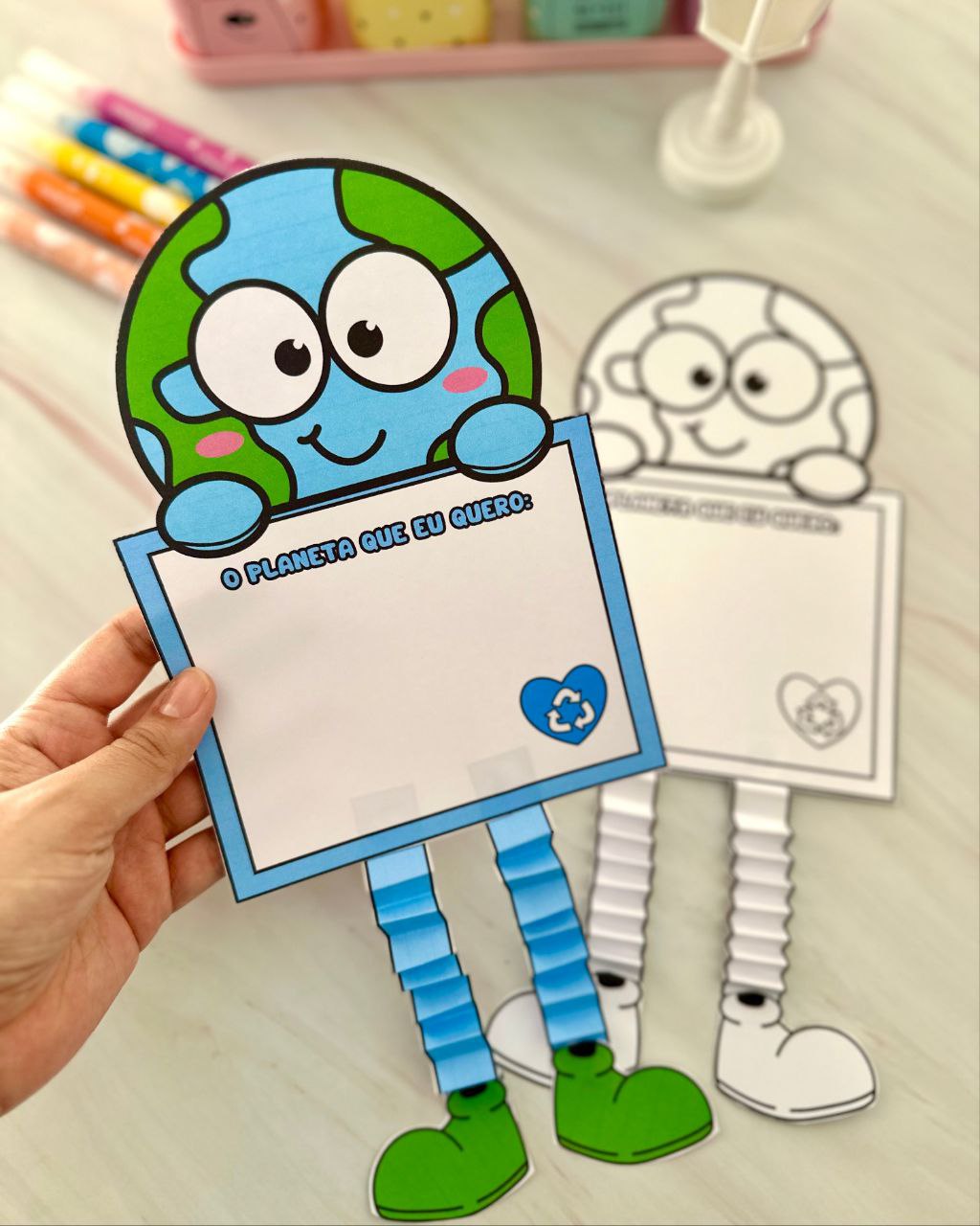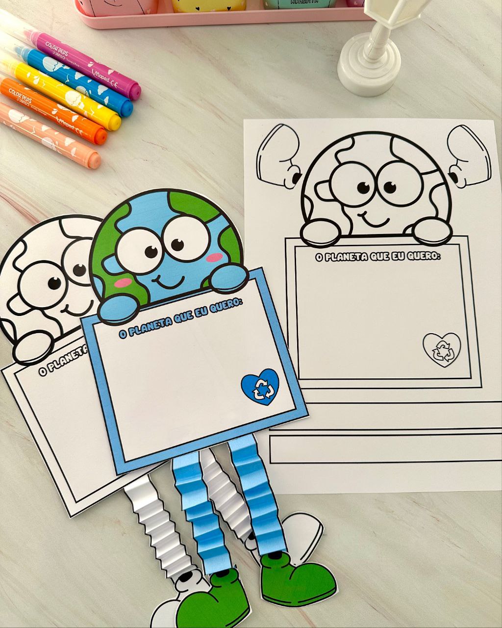 A criança pode fazer um desenho ou escrever uma frase sobre o Planeta que ela quer, e também irá recortar as tiras e fazer dobraduras conforme a foto modelo que vai no arquivo.