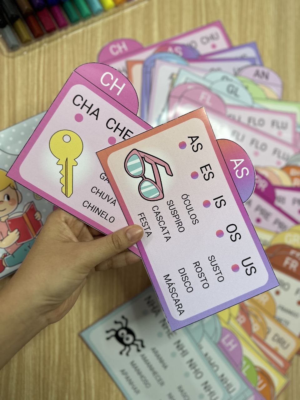 As fichas são organizadas por cores e possuem indicação superior, facilitando a organização e o agrupamento por famílias silábicas.