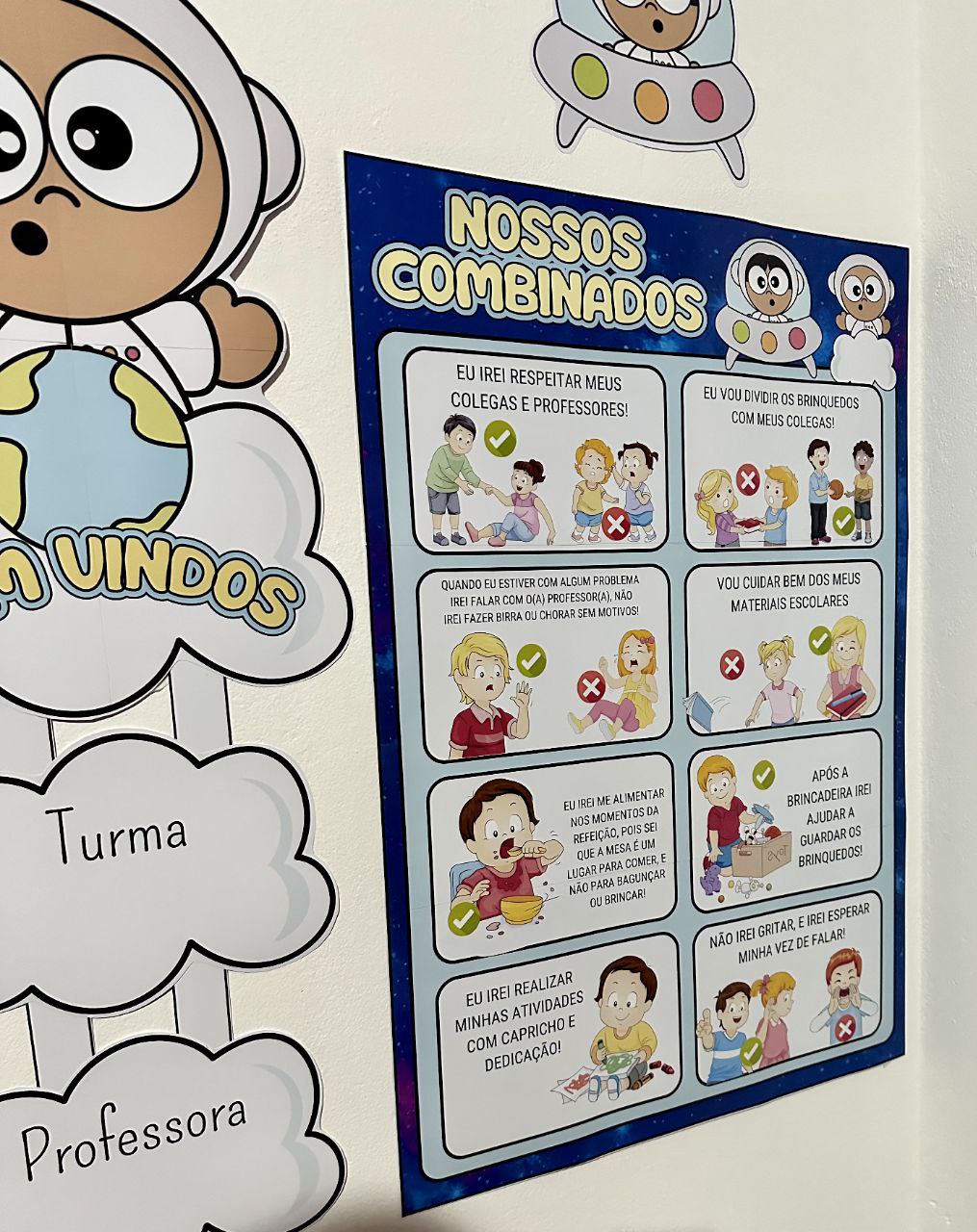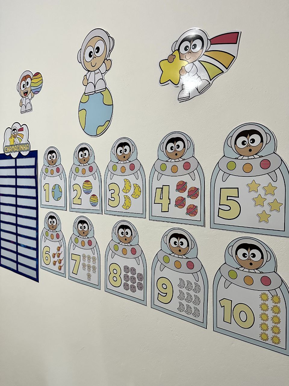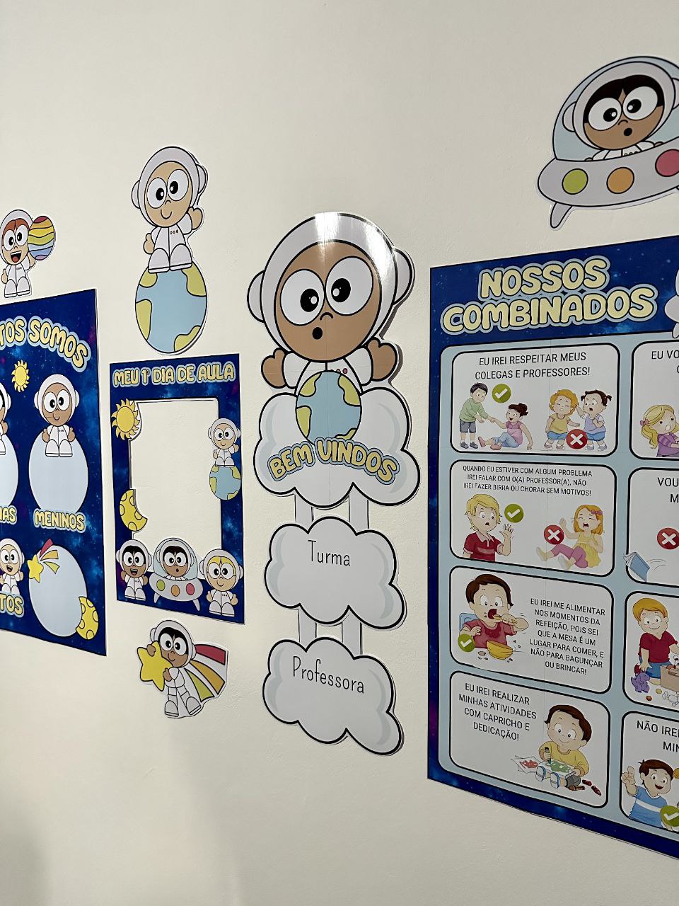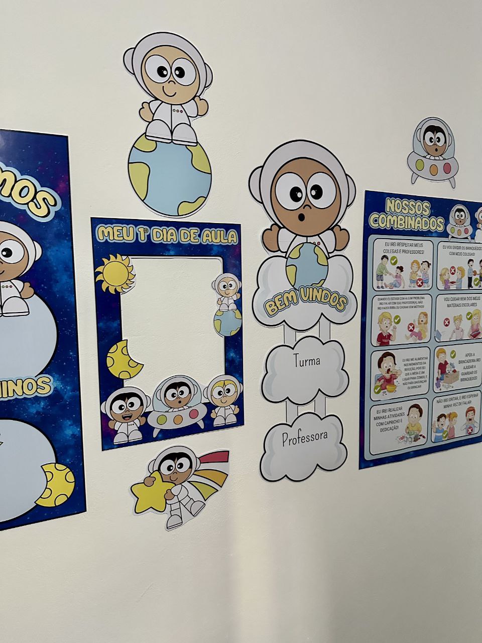 O kit decoração de sala de aula Astronauta vai em PDF, pronto para impressão.